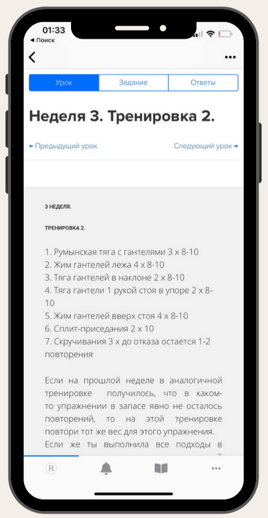 — Для этого курса вам обязательно понадобятся штанга и наборные гантели. Если ваш уровень совсем начальный, то для этой программы вам понадобятся, как минимум, гантели следующих параметров: 2 гантельных грифа, 4 диска по 5 кг, 4 диска по 2 кг, 4 диска по 1 кг, 4 диска по 0,5. В процессе возможно придется докупать диски.
